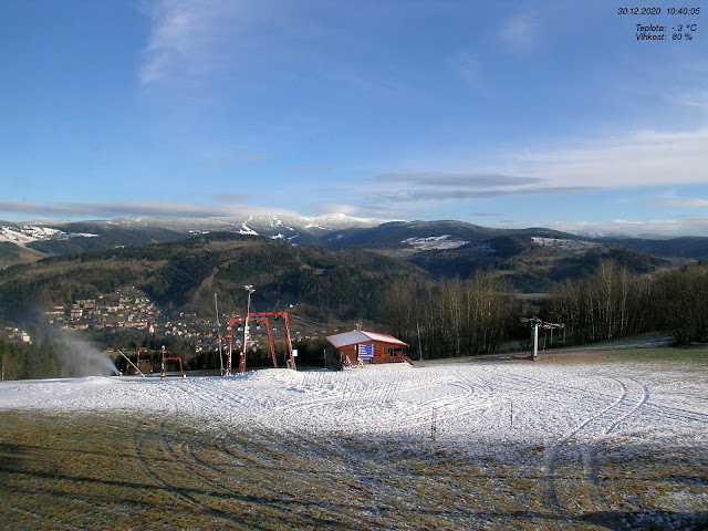 29. prosince. Ojinene - umelym zasnezovanim - sedacky lanovky v Rejdicich, v dalce zahledneme Bezdez. Pohled na teploty poslednich dnu