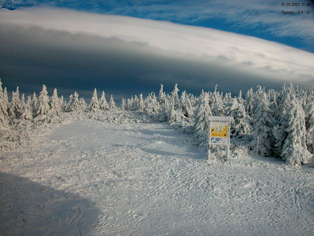 3. ledna. Nocni a ranni dest - konecne nejake srazky po delsi dobe. Nasnezilo zhruba od 800 metru vyse. Opticky pribylo snehu pomerne malo i napr. na Jizerce ale tam ta pokryvka aspon snad zesilila v tom, ze poprasek se promenil v cvachtu. Koukam na