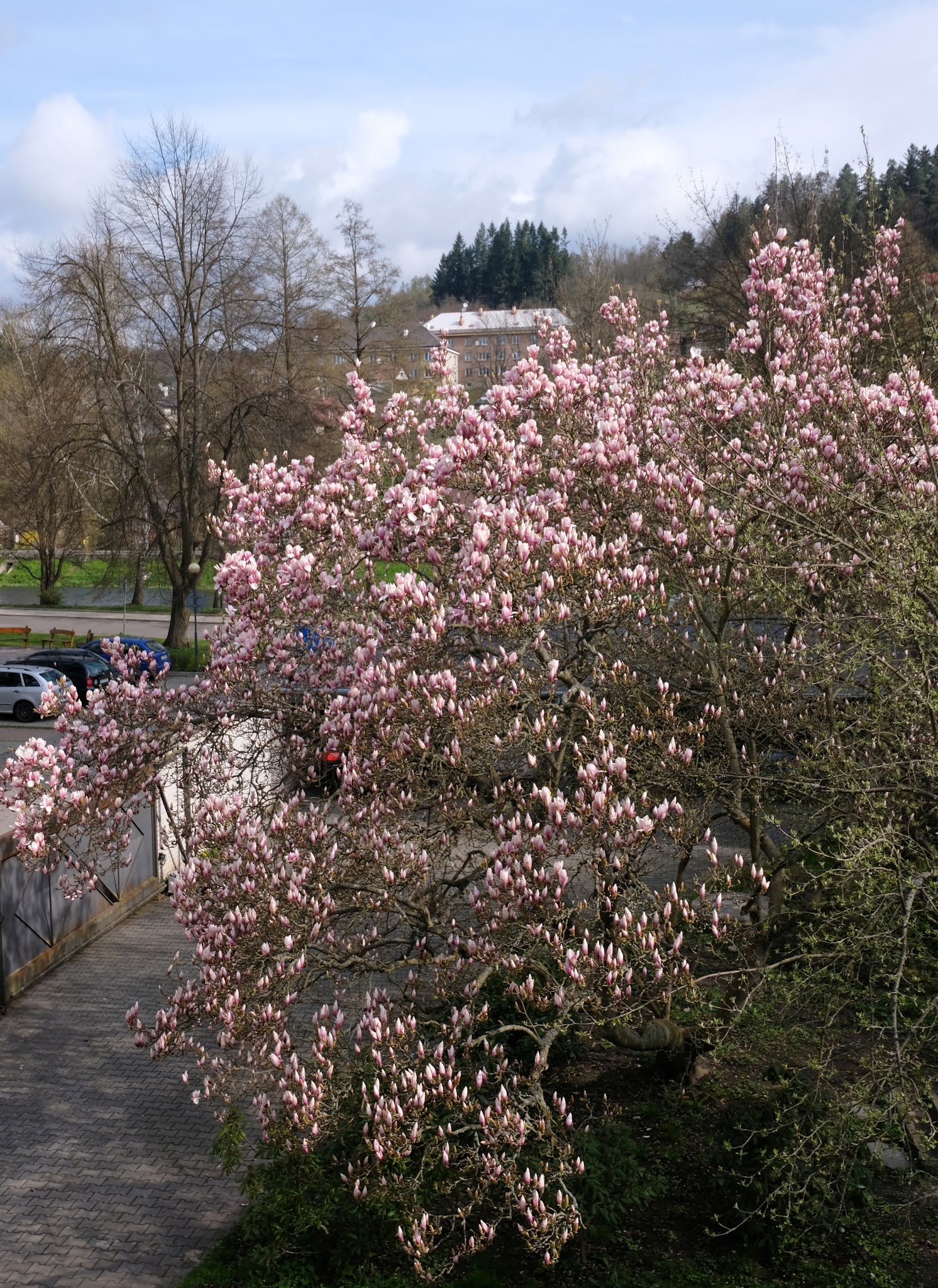 3.5. Magnolie na nasi zahrade v Brode, takhle typicky vypadala zacatkem kvetna v chladnych jarech pred 30 - 60 lety, a podvecer na Kamenci, v Polubnem a na Lyse hore