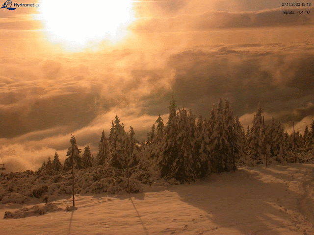 15. 11. Hrebeny Krkonos uz asi dlouho nezustanou bezesnezne, dnes opet inverse a porad pomerne jeste